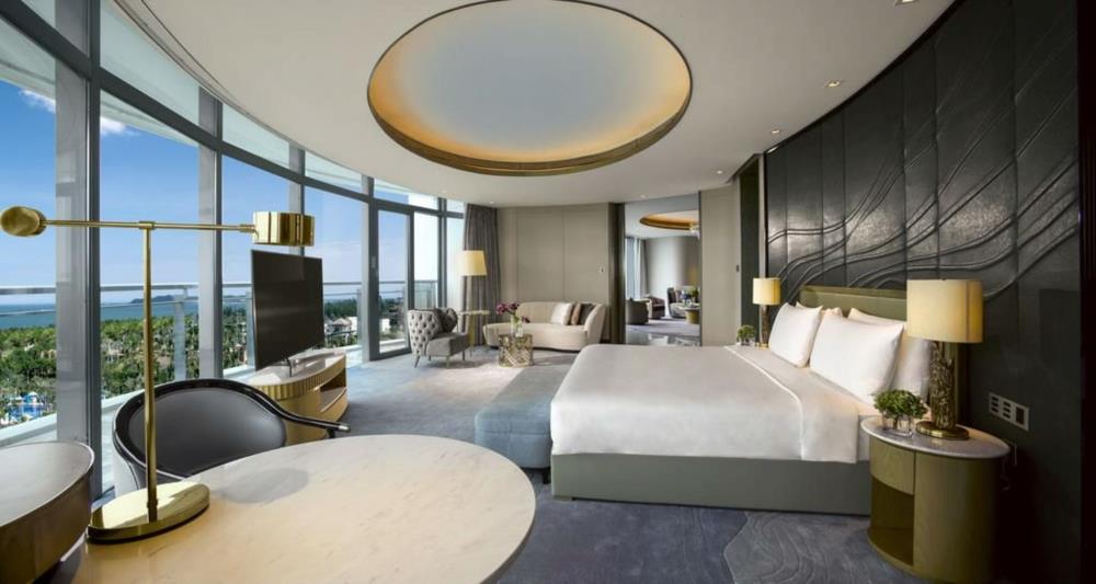- Royal Suite (ок. 564m2)(макс. 4 взрослых и 2 детей) - номер с двумя гостиными с фиолетовыми оттенками, царственной мебелью и современным дизайном, с балконом с видом на залив Хайтан, песчаный пляж и остров Учжичжоу и двумя спальнями. В главной спальне 2 ванные комнаты, а также огромная ванна с видом на океан. Во второй спальне есть собственная просторная ванная комната. Круглосуточное обслуживание дворецкого. Комплимент от отеля - уточняйте у менеджера при бронировании.